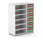 • Gavetero escolar altura 112cm serie Esak , combinando 1 lateral con 12 gavetas pequeñas (o 6 gavetas grandes) cada uno, y el centro con 5 estante regulables en altura.