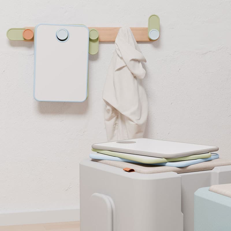 El Perchero Slide destaca por su estructura de madera de abedul de Mainau y sus 5 ganchos combinables en color y orientación. Los ganchos, además de ser robustos, pueden orientarse según la preferencia del usuario, optimizando así el aprovechamiento del espacio.