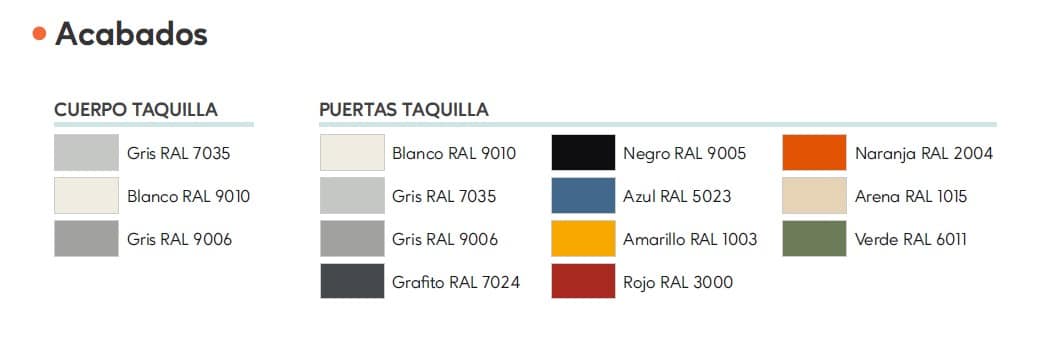 - Color de puertas a elegir: Blanco RAL 9010, Gris claro RAL 7035 y Gris metalizado RAL 9006, Grafito RAL 7024, Negro RAL 9005, Azul talco RAL 5014, Amarillo curry RAL 1032, Rojo arcilla RAL 3014, Arena RAL 1015 y Verde talco RAL 6019.