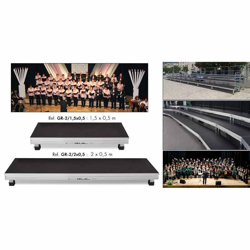 La Tarima de aluminio TM300 combina versatilidad con estabilidad, gran resistencia y fácil montaje. Ofrece la mejor solución para cualquier tipo de evento, desde pequeños montajes en aulas a grandes escenarios, pudiéndose utilizar en múltiples configuraciones tanto para instalaciones permanentes como temporales (conciertos, teatros, auditórium, conservatorios, fórums, etc.).