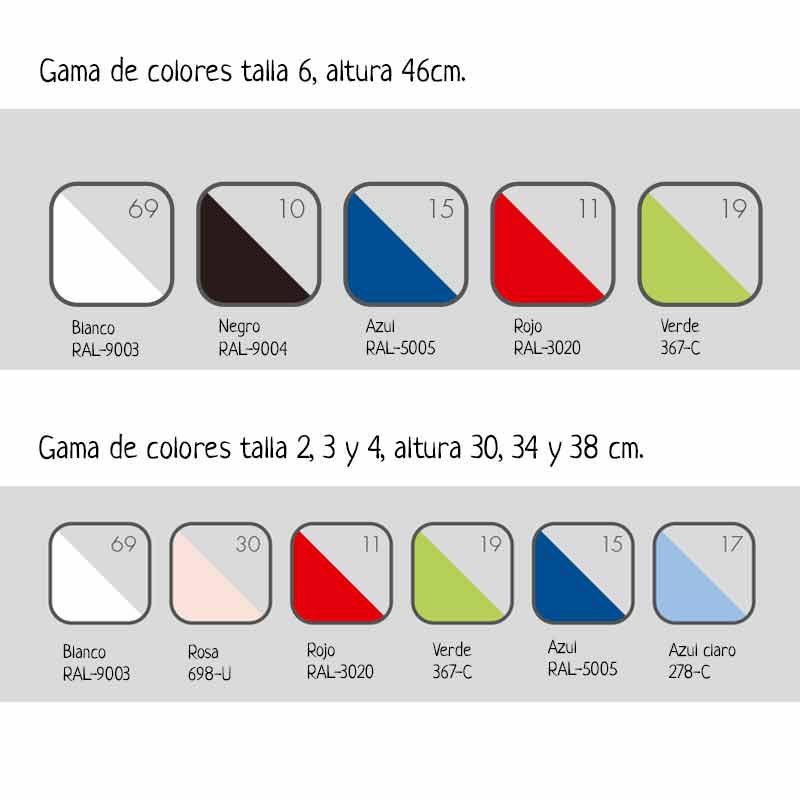 • Colores talla 6: Blanco, negro, rojo, verde y azul oscuro.
