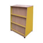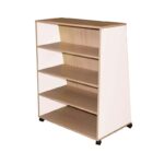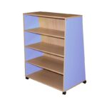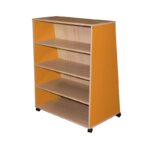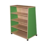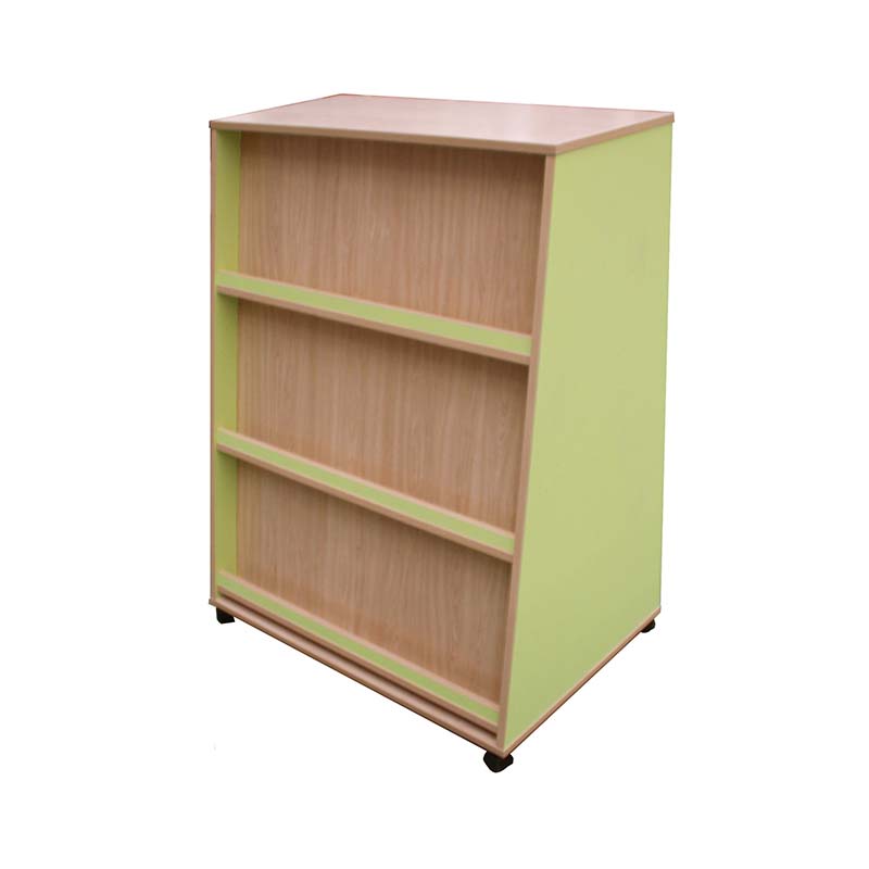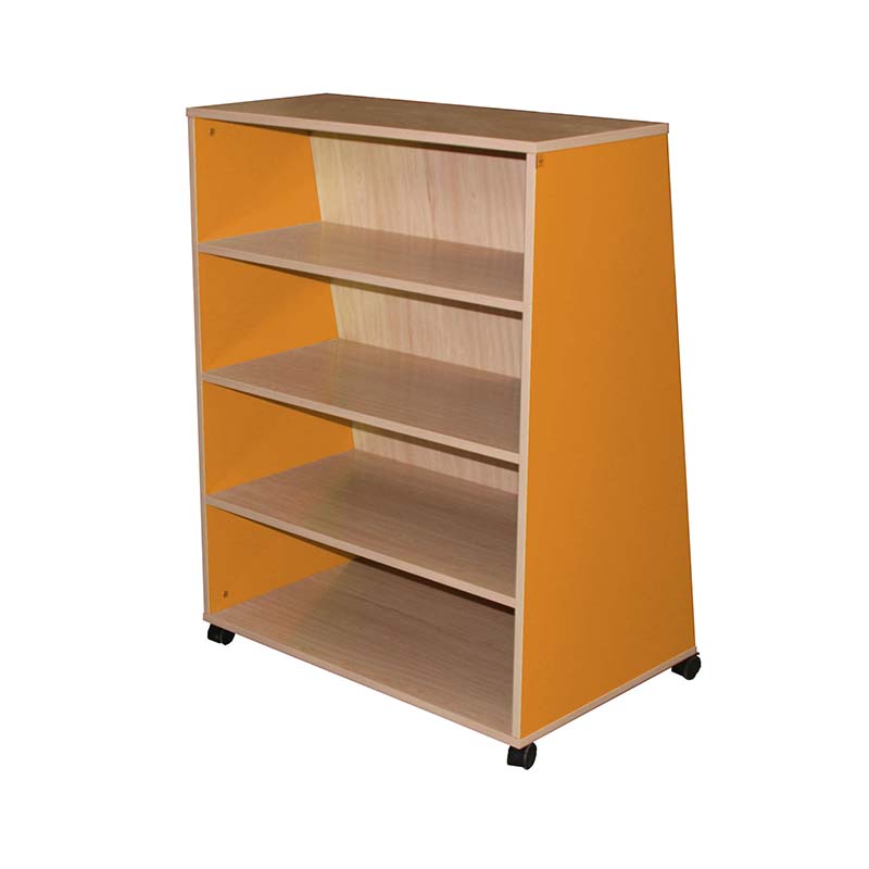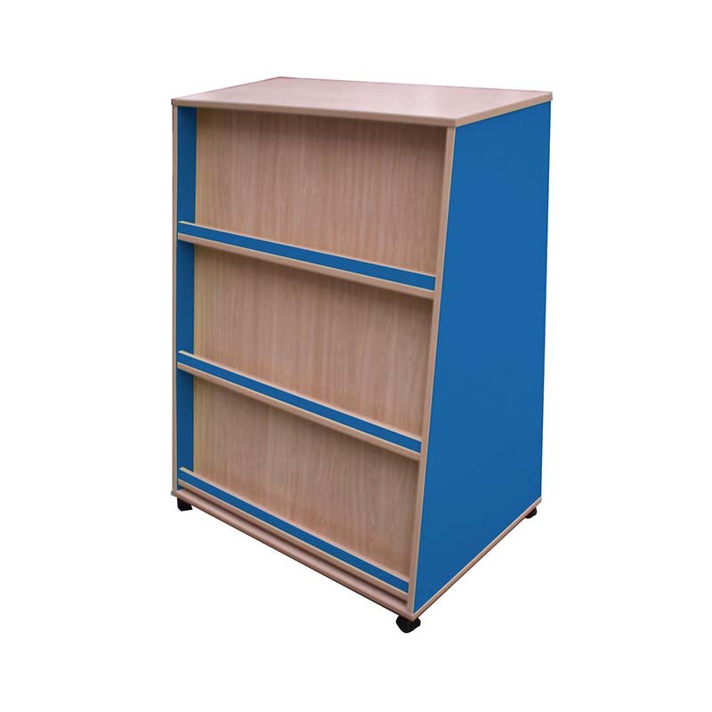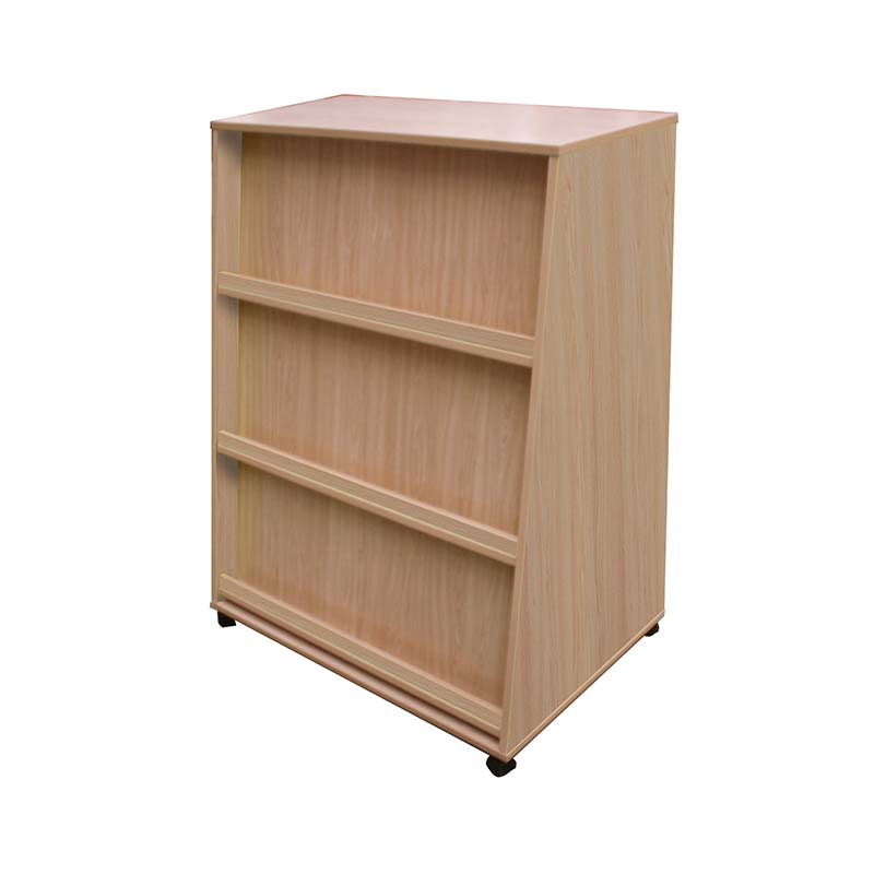 Carro expositor doble cara por una de las caras permite almacenar y exponer libros apoyados en un frente de tablero situado por delante, lo que impide la caída de los mismos. Por la otra cara dispone de zona estantería donde poder almacenar todo tipo de elementos de lectura o cualquier material