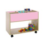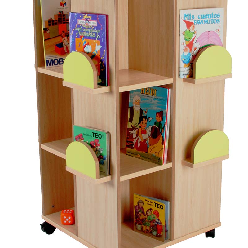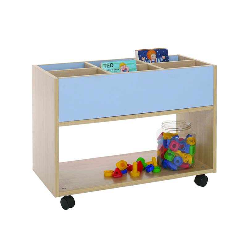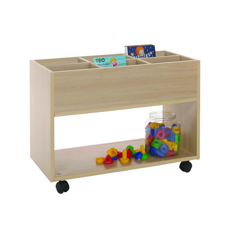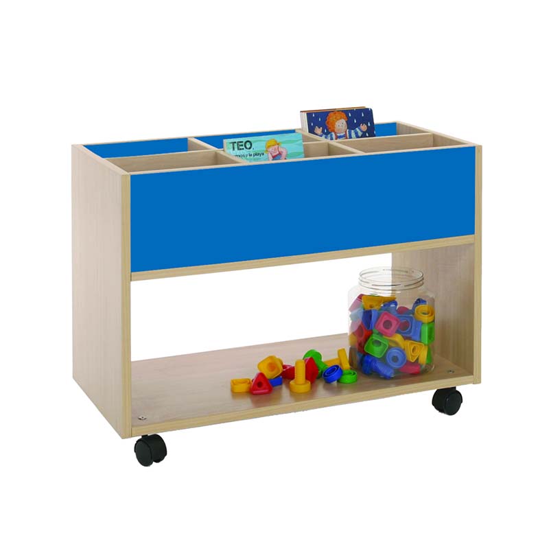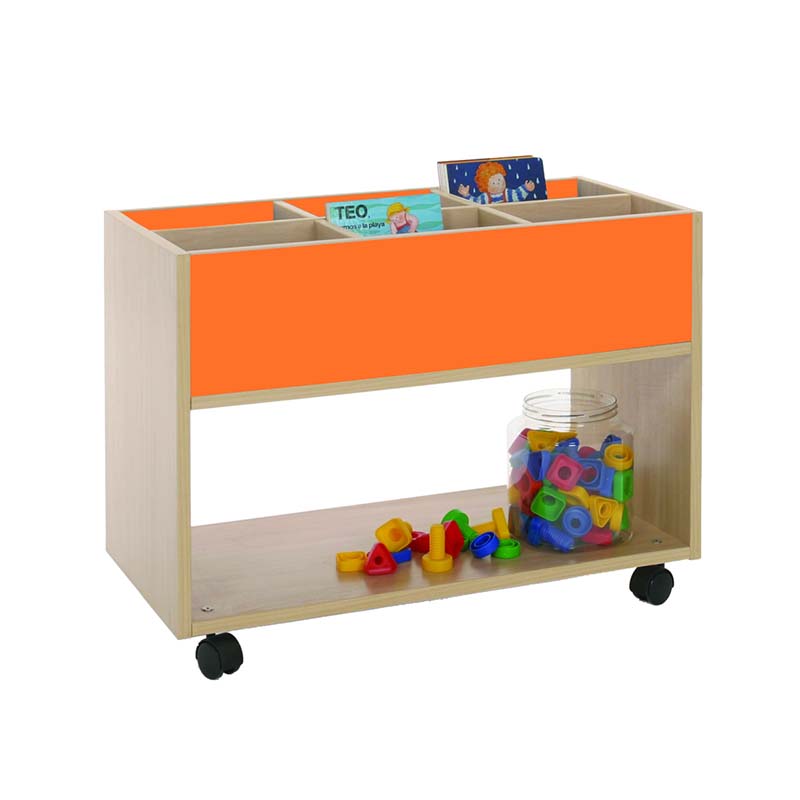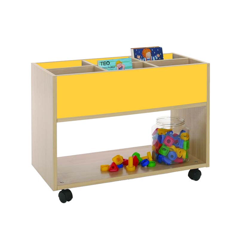 Este carro librería alto esta compuesto de 6 casillas de almacenamiento y parte baja accesible por las dos caras. Ideal para equipar bibliotecas infantiles.