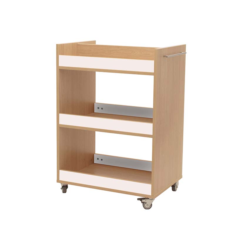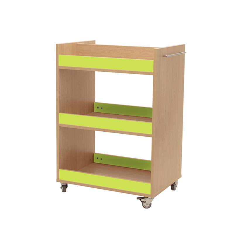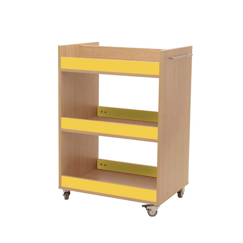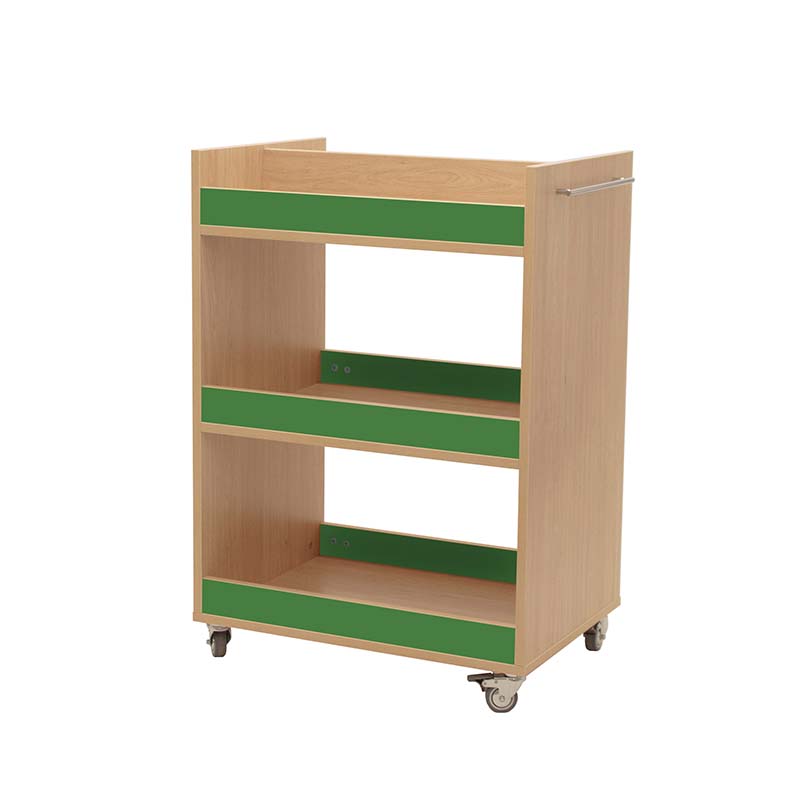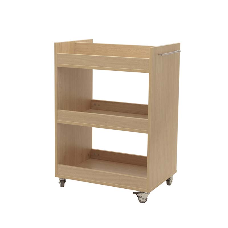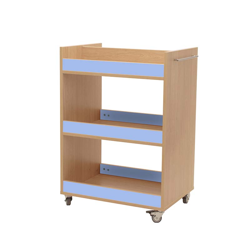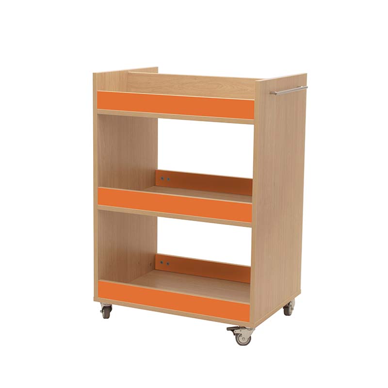 Carro librería compuesto por 3 baldas con frentes, para el almacenamiento y transporte de libros. Balda superior dividida por la mitad. Accesible por las dos caras.