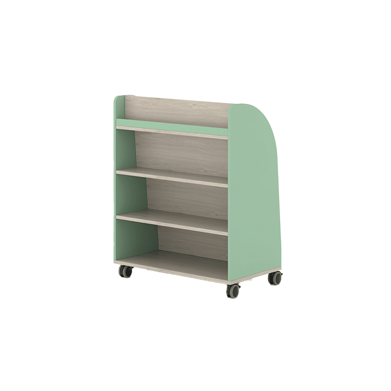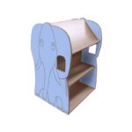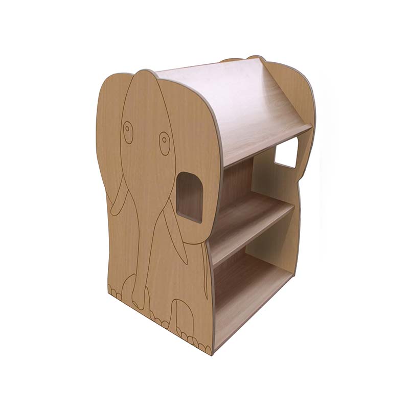 Mueble expositor biblioteca elefante, con zona expositor arriba y estantería para almacenar libros abajo, en ambos lados. Ideal para el equipamiento de bibliotecas infantiles.