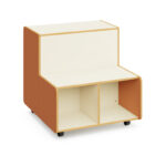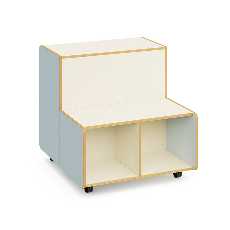 Grada escolar modular Kido con almacenaje y acabado en madera de arce. Cuenta con cuatro asientos y seis espacios de almacenamiento abiertos. Ideal para equipar bibliotecas y aulas en centros educativos, ya que permite crear diferentes espacios de aprendizaje y delimitar áreas.