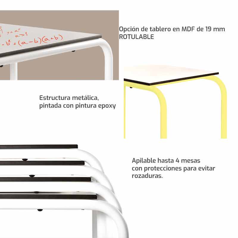 - Apilables hasta 4 mesas. Resistente y con protecciones para prevenir rozaduras.