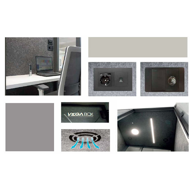La cabina acústica VEGA BOX 2 El interior de VEGA BOX 2 es diáfano, para poder utilizarla como sala de reunión para 2 personas con sillas, bancos o puf complementarios.          Conexiones de carga, ventilación con regulación de potencia  y doble iluminación con sensor de presencia. Pero además, se puede transformar en un tranquilo despacho de trabajo (WorkStation) incluyendo la mesa opcional VEGA 2 WS y una silla de oficina de nuestro catálogo.