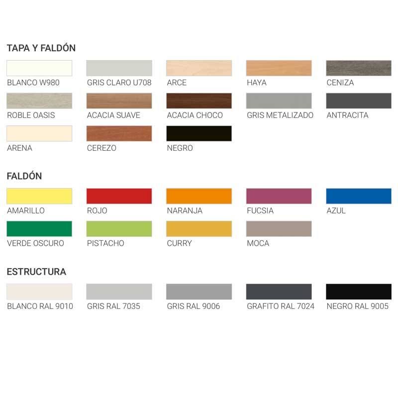 acacia choco, acacia suave, Amarillo curry, antracita, arce, arena, Azul talco, blanco, Cerezo, gris claro, gris metalizado, haya, moca, negro, roble oasis, Rojo arcilla, Verde talco