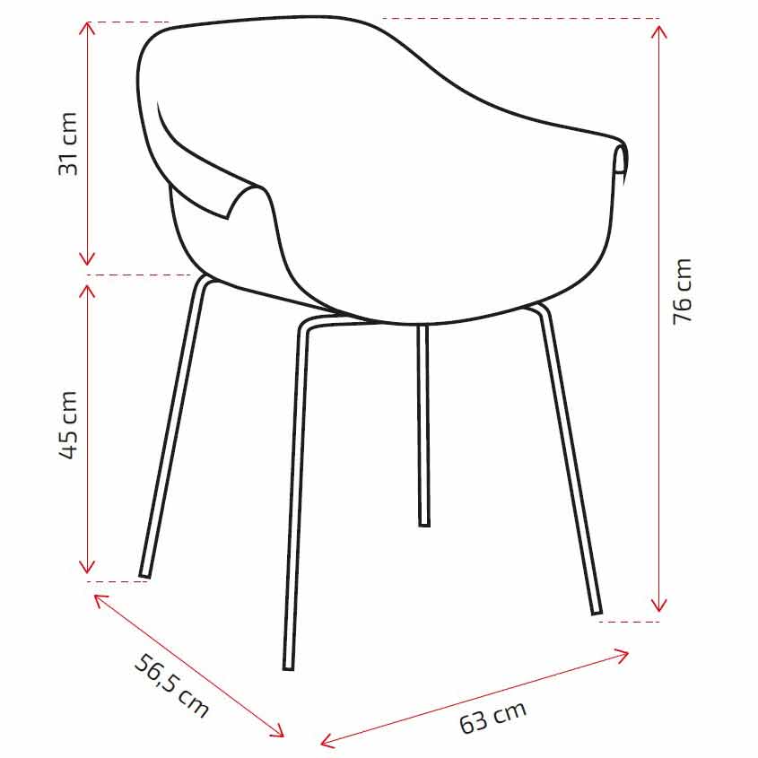 Silla Saki2 con estructura metálica con 4 patas y respaldo ergonómico con reposabrazos para un óptimo confort. Versátil y resistente.
