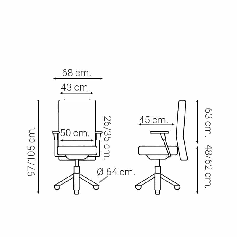 - 45cm fondo x 68cm ancho x 102/115cm altura. Altura del asiento 48/62 cm.