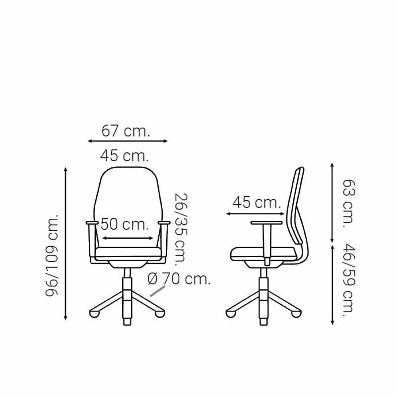• 45cm fondo x 50cm ancho x 96/109cm altura. Altura del asiento 46/59 cm.
