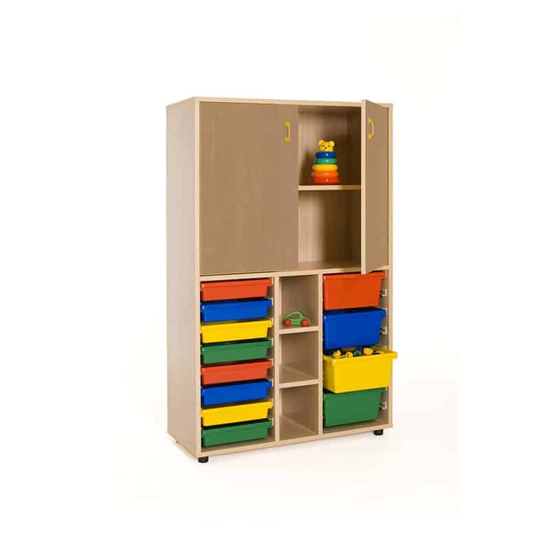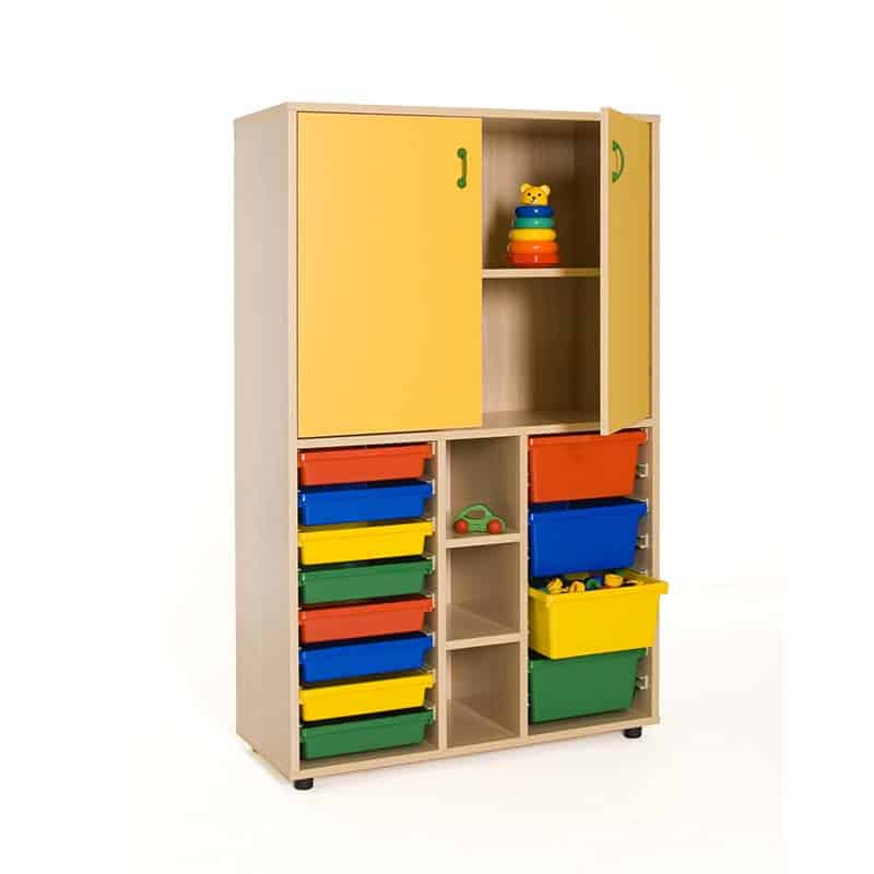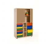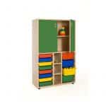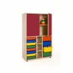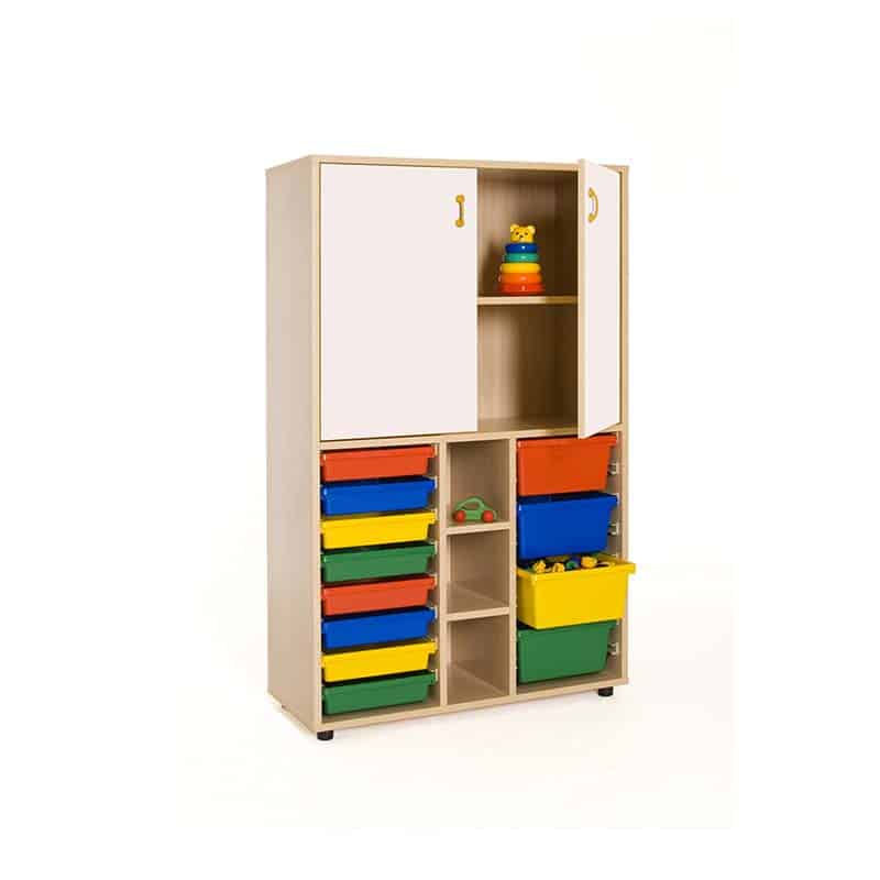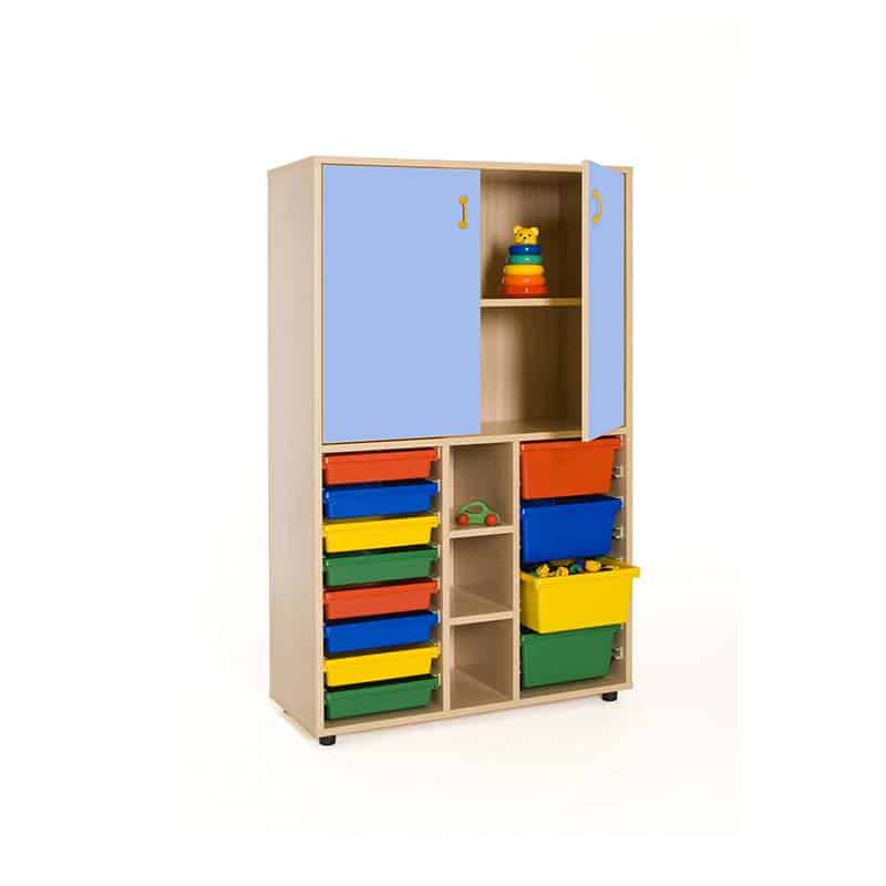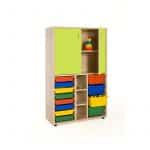 Este modelo de Armario gavetero medio puertas altas, forma parte de nuestro catálogo de mobiliario escolar infantil. El cual está indicado para clases de Primaria.