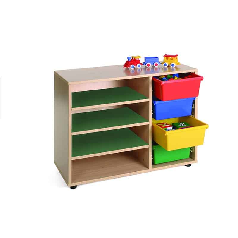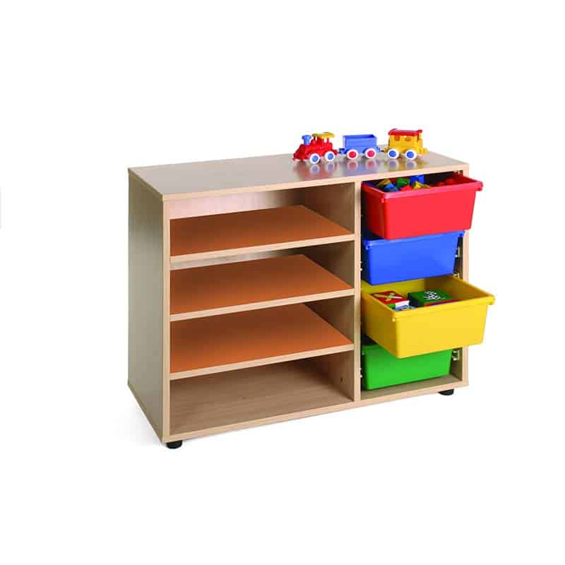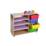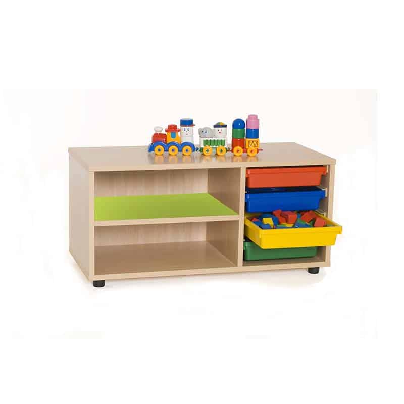 Este modelo de Gavetero estantería bajo, forma parte de nuestro catálogo de mobiliario escolar infantil. El cual está indicado para clases de Primaria.