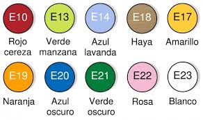 Amarillo-e17, Azul-e20, Azul-lavanda-e14, blanco-e23, Haya-e18, Naranja-e19, Rojo-e10, rosa-e22, Verde oscuro-e21, verde-manzana-e13