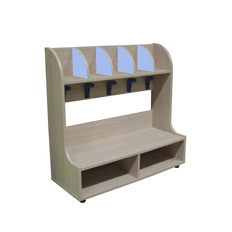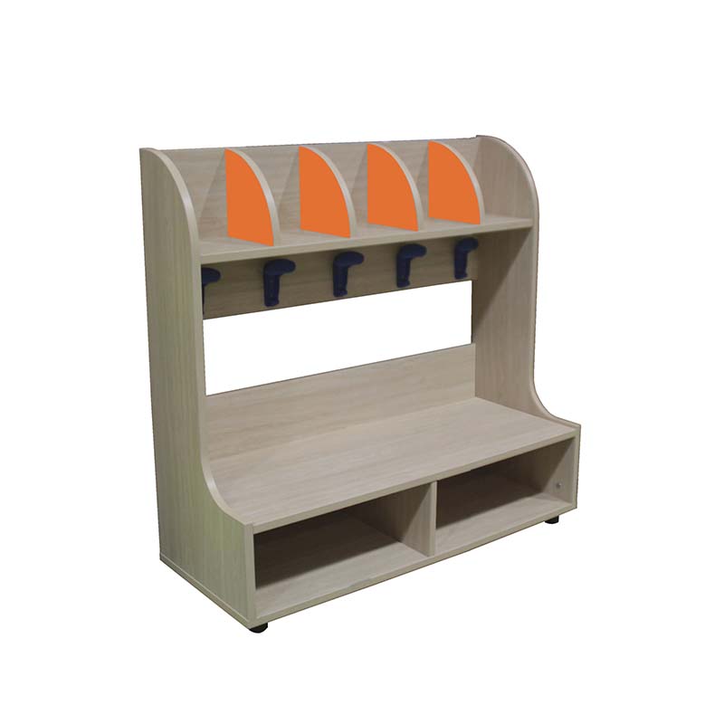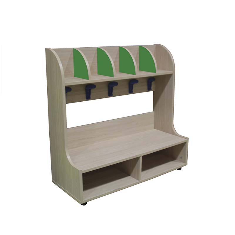 Banco zapatero-perchero 5 casillas, zapatero en la parte inferior con dos huecos, perchero con cinco casillas y cinco perchas en la parte superior. El cual está indicado para clases de infantil.