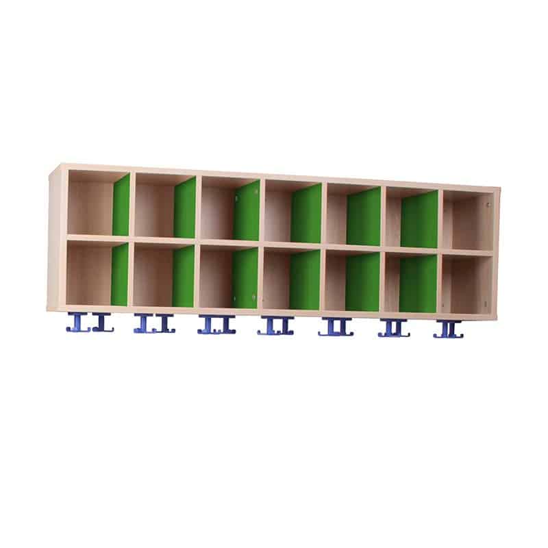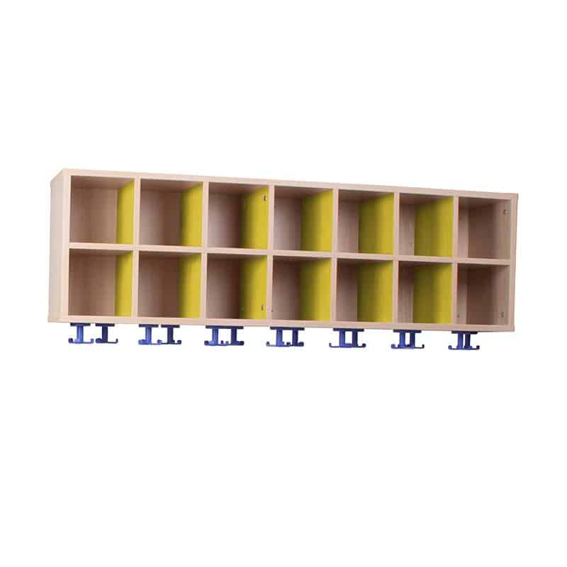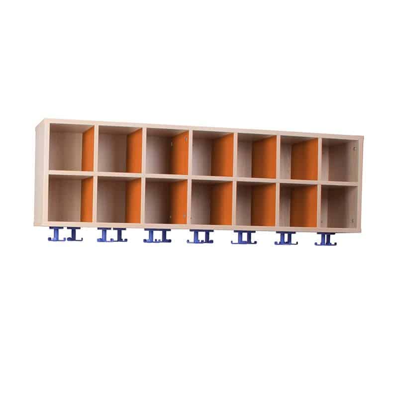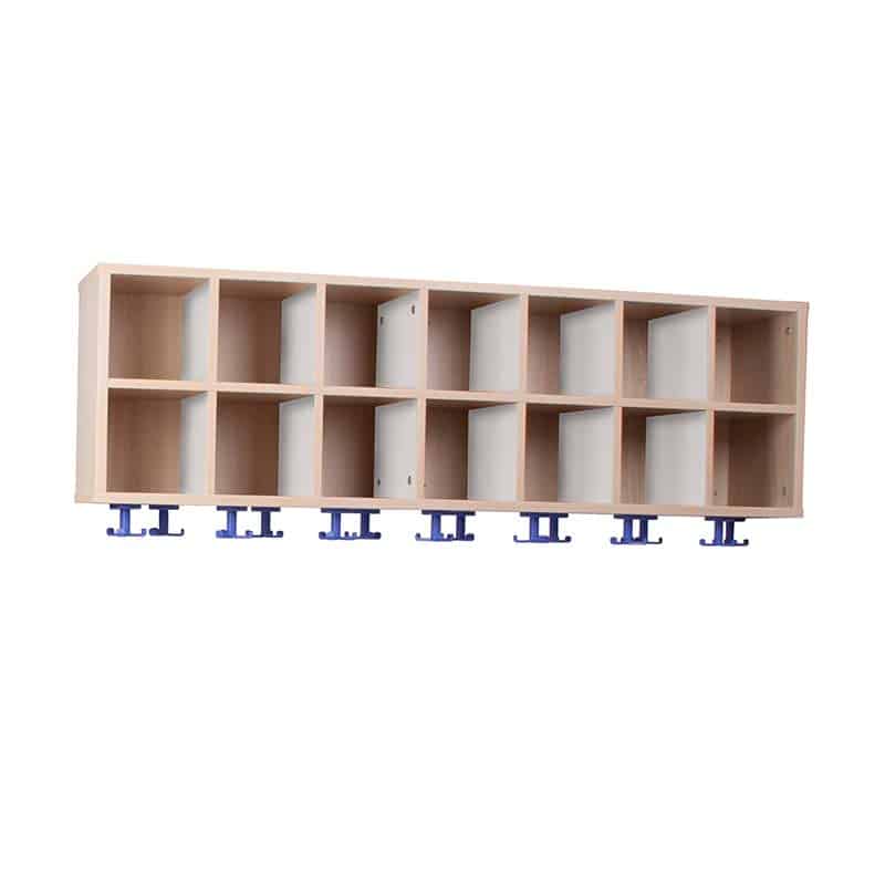 Este modelo de Perchero con 14 casillas, forma parte de nuestro catálogo de mobiliario escolar infantil. El cual está indicado para clases de Primaria.