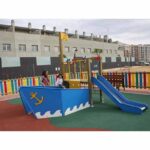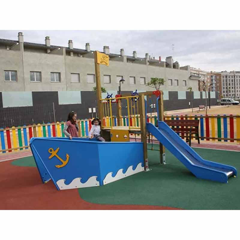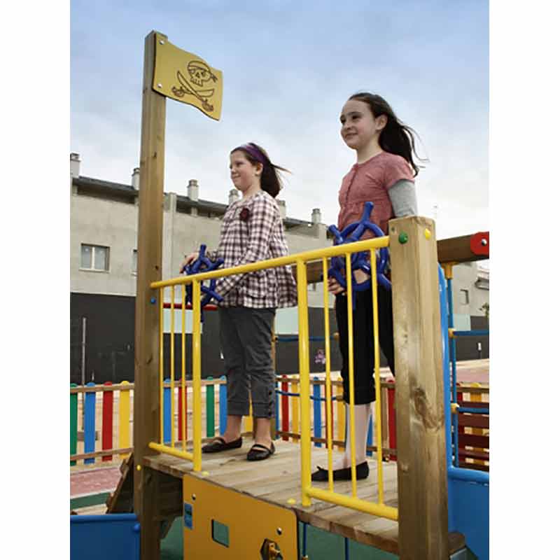 - Juego compacto con forma de barquito compuesto por un tobogán, rampa para subir al juego, una plataforma, banco para sentarse en la proa del barquito, red para trepar, elemento de escalada y dos timones para conducir el barco.