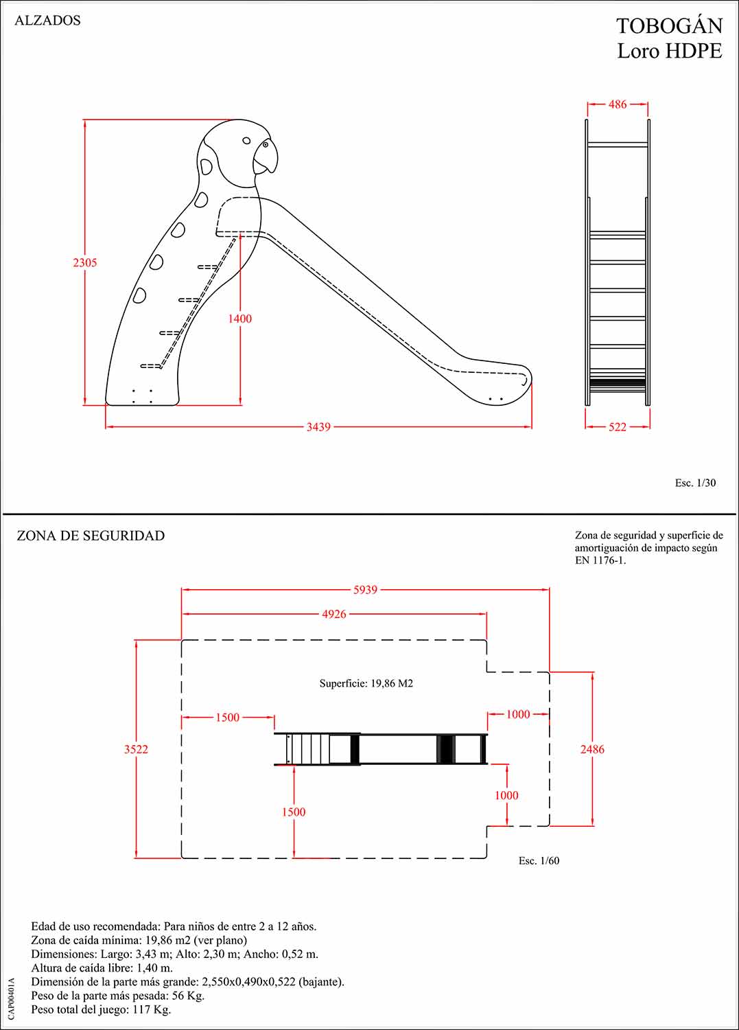 - Laterales con placas decorativas con forma de Loro HDPE (Polietileno de alta densidad).