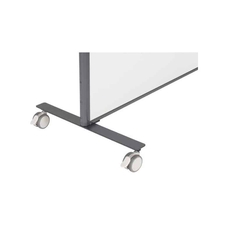 Panel separador móvil pizarra blanca a doble cara, superficies de escritura blancas de acero lacado (magnéticas) para rotuladores de borrado en seco e imanes. Estructura metálica con gran estabilidad, lacada en color gris oscuro. Incorpora ruedas con frenos para una fácil traslado.