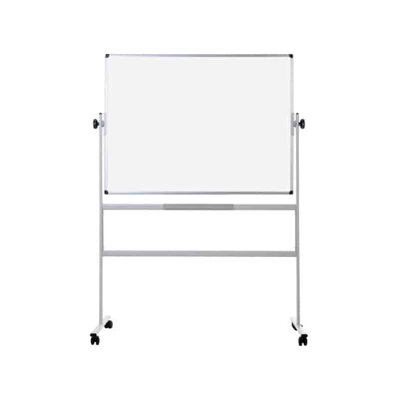 Pizarra giratoria doble cara eco, volteable con dos caras de trabajo blancas de acero lacado (magnéticas) y con soportes con ruedas. Disponible en diferentes formatos
