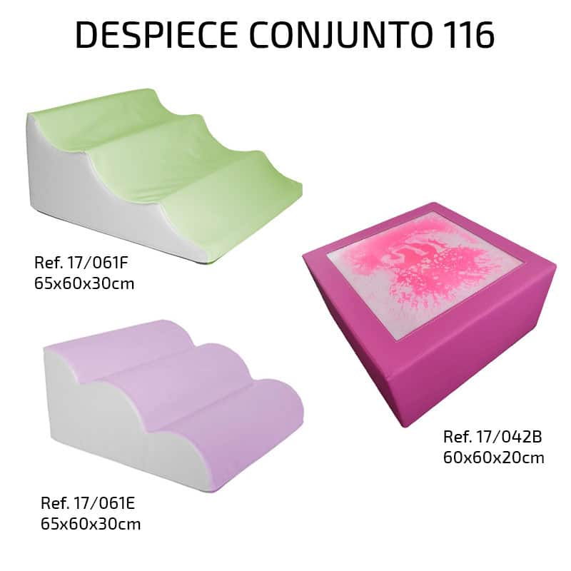 Este modelo de conjunto de Psicomotricidad numero 116, compuesto de 3 piezas, forma para de nuestros productos especializados para escuelas y centros infantiles, pensados para fortalecer el desarrollo de los niños en gimnasia y psicomotricidad. Estos productos de psicomotriz se recomiendan hasta 3 años de edad ya que cuentan con pequeñas alturas, tactos suaves y materiales totalmente aptos para mordeduras, así como antibacterianos.