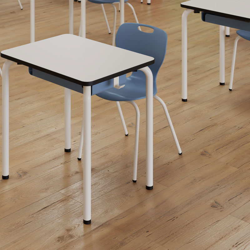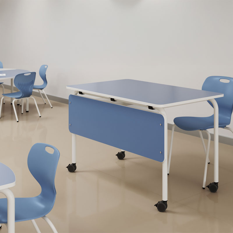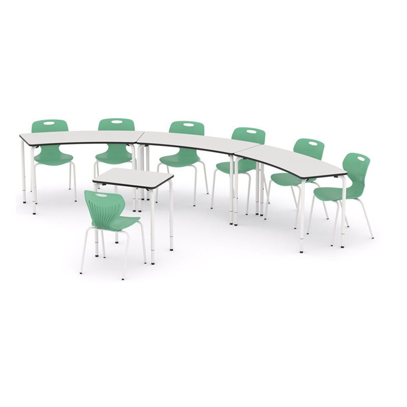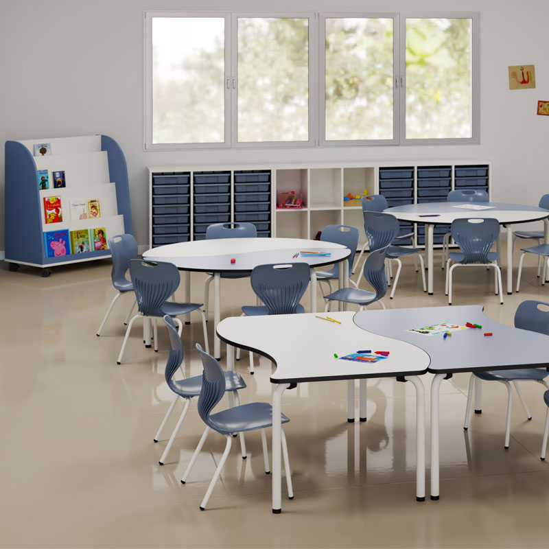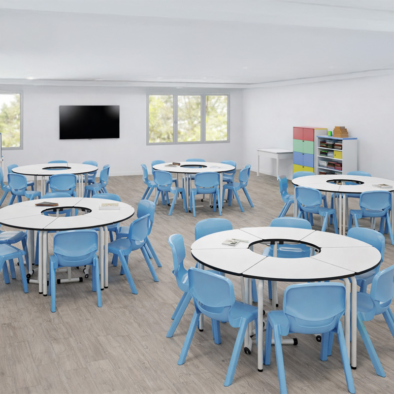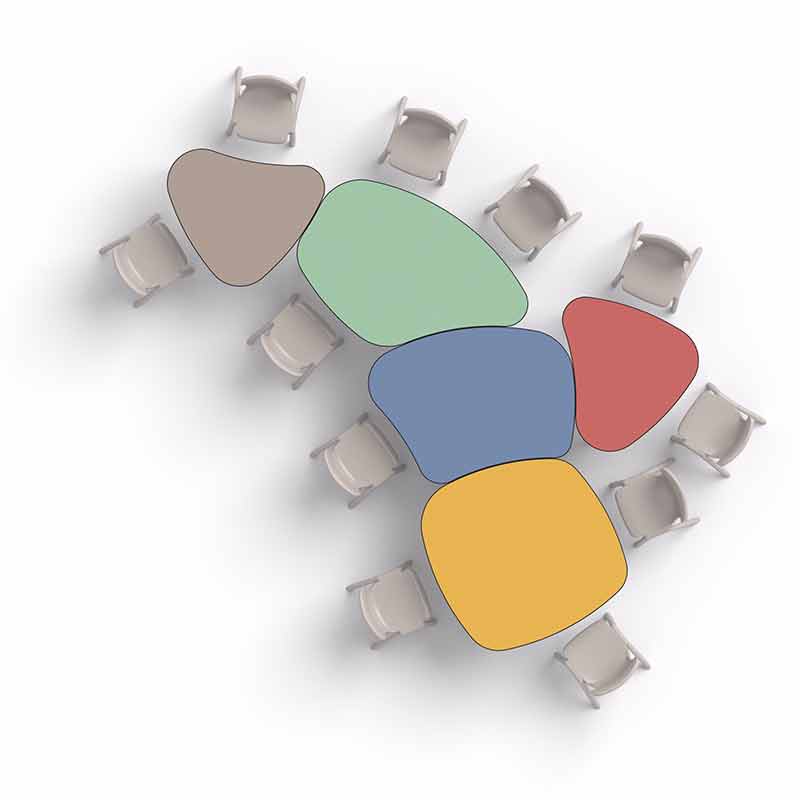 Incluye 14 formas diferentes de mesas colaborativas, junto con una amplia paleta de colores que permite adaptar el aula a la identidad y necesidades de cada centro.